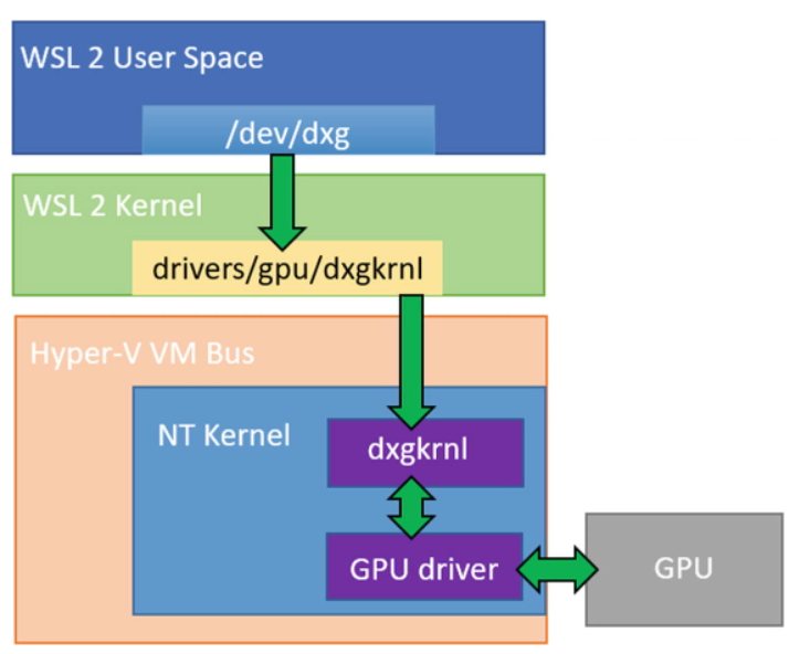 - GPU 병렬처리를 이용하려면 새로운 커널 드라이버인 /dev/dxgkrnl을 사용하면 WDDM(윈도우 디스플레이 드라이버 모델)을 통해 NT커널에서 제공하는 GPU 기능을 이용할 수 있다. 패스-쓰루 드라이버인 셈. 현재는 GPU연산과 오프스크린 렌더링만 지원되고 있음.