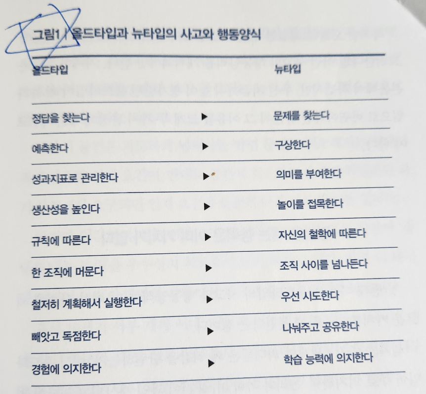 다시 꺼내서 읽은 책은 <뉴타입의 시대>이다. 2019년에 출간된 책이니, 코로나가 한창 기승을 부릴 때 쓰인 책이다. 미래 예측이 어려워지고, 전세계적으로 재택/원격근무가 확산되던 때 미래에 대한 모습을 조망한 책이었다. 그런데 이번에 다시 읽으면서 흥미로웠던 점은 코로나 뿐만 아니라 AI 역시 뉴타입에 비슷한 영향을 미치고 있다는 생각이 들었다. 그래서 AI가 가져온 변화를 중심에 두고 올드 타입과 뉴 타입의 특징을 비교하며 내가 무엇을 보완해야 할지를 생각하면서 읽었다. 여전히 유용한 내용이 많았다.
