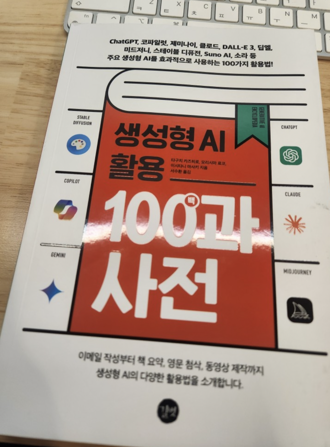 트위터 이벤트 당첨으로 길벗출판사에서 나온 생성형 AI 활용 100과 사전을 읽었습니다.
