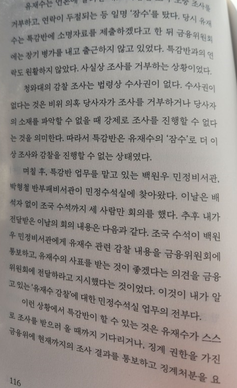 집에 조국 의원이 쓴 책도 있지만, 이 책은 조국 의원을 옆에서 지켜보면서 함께 일한 동료의 이야기입니다. 서울대 교수였던 조국 의원이 민정 수석이 되고, 그 과정에서 학자의 이상을 펼치기 위해 노력했고, 그 과정에서 겪었던 고충과 고뇌를 담담하게 정리하고 있습니다.