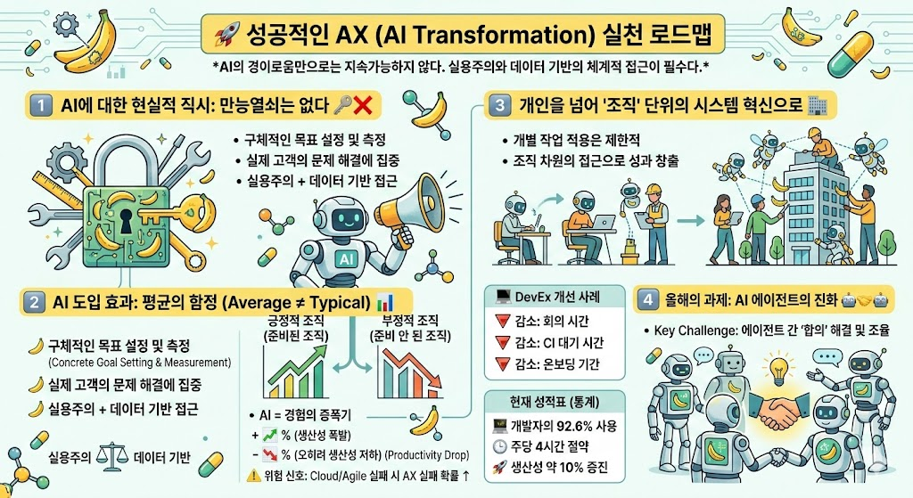 - AX가 성공하려면 구체적인 목표 설정 및 측정, 실제 고객의 문제 해결에 집중하는 체계적인 접근이 필수다. AI가 모든 문제를 해결해주는 만능열쇠는 아니며, 현실적인 문제해결과 균형이 맞아야 한다.