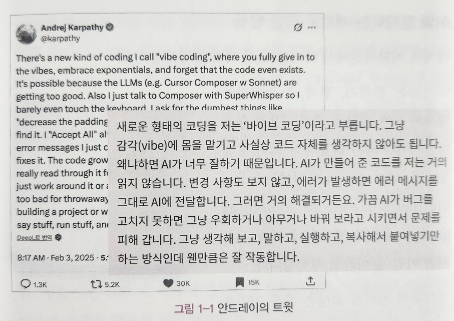 책 표지에 문구처럼, 이 책은 '일상과 업무에 AI를 더하는 방법'을 이야기하려한다. 기술전문가가 되기 위한 길을 제시하는 책이라기 보다는, 기술을 두려워하지 않게 도와주는 책이다. 바이브코딩이라는 이름을 달고 있지만, 읽다보니 '1일 1로그 100일 완성 IT 지식'과 비슷한 결의 교양서적같다는 느낌도 받았다.