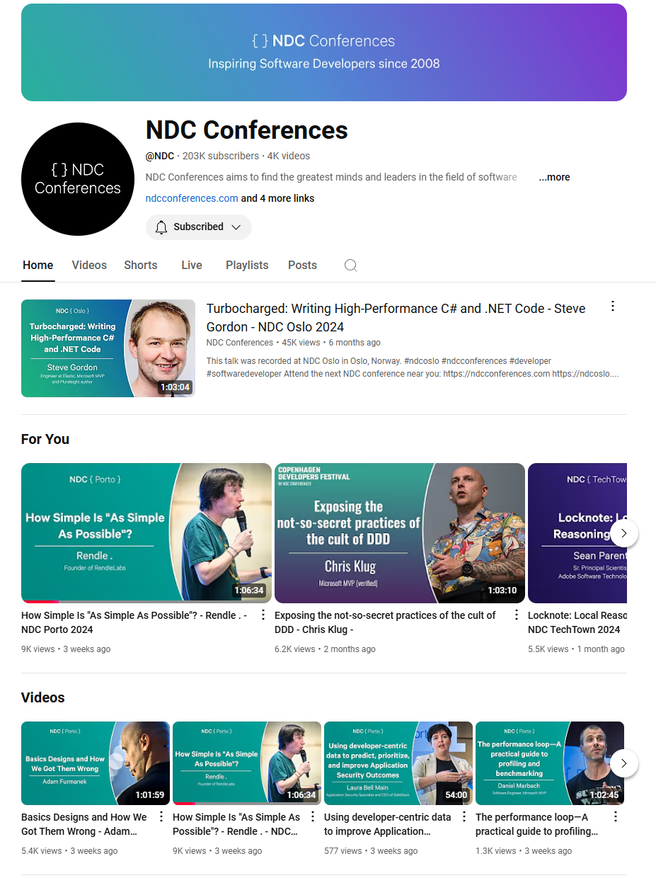 제가 좋아하는 컨퍼런스 중에 NDC가 있습니다. 넥슨에서 주최하는 NDC말고요. 주로 오슬로나 멜버른에서 열립니다. https://ndcconferences.com/인데, 컨퍼런스가 끝나면 얼마지나지 않아 세션을 유튜브에 공개합니다. 유튜브 채널은 https://www.youtube.com/@NDC 입니다.