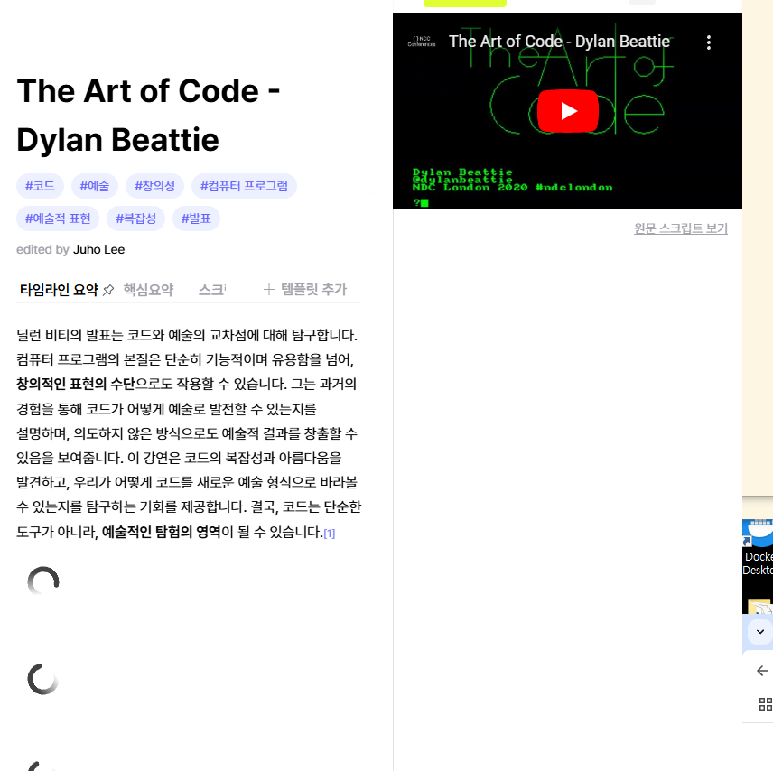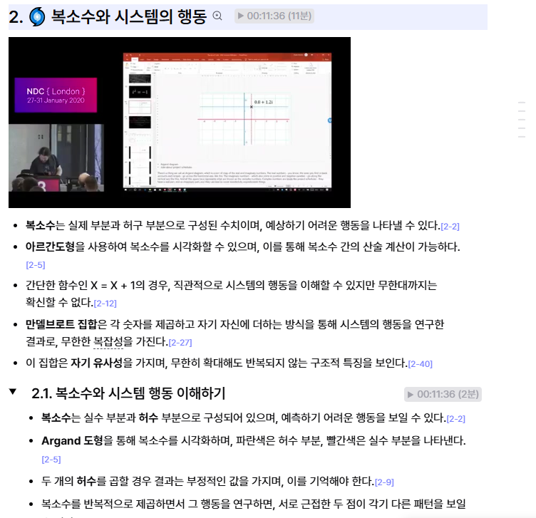 이제 실제 연사의 발표 내용에 집중할 수 있네요. 실제로 듣고 싶은 부분, 특히 발표 슬라이드와 함께 보고 싶은 부분이 있다면 시간을 클릭해서 해당 부분을 요약본 및 자막과 함께 볼 수 있습니다. AI는 우리의 학습 방식을 혁신적으로 변화시키고 있습니다. 아 좋은 세상!!