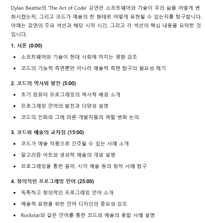 그 전에는 유튜브의 자막을 가져와서 그것을 GPT에 요약해 달라고 요청하고, 프롬프트도 조금 손을 봤어야 하는데 릴리즈를 이용하면 한방에 됩니다. 이제 발표자가 전달하고 싶은 이야기에 집중하면 되네요.