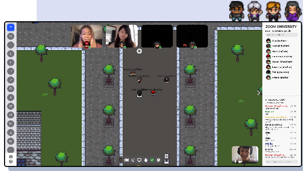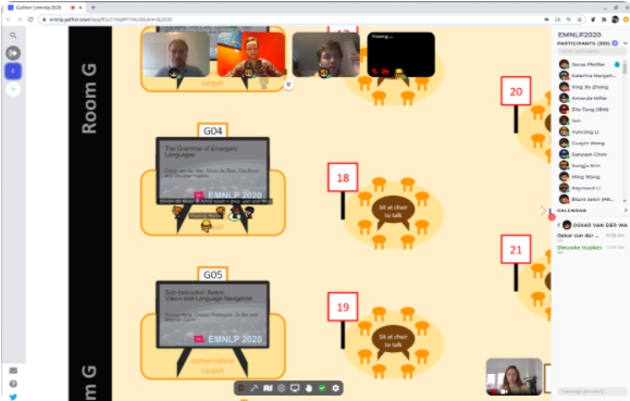 각 공간은 현실세계의 속성을 반영하는데, 예를 들어 Conference 모드일 경우 세션 발표장, 포스터 발표장, 미팅 룸 등의 속성을 가진다. 아바타들이 인근 공간에 모이게 되면 자동으로 화상채팅이 시작된다. 또한 재미있는 것은 TV 근처로 이동했을 경우이다. TV 근처로 가면 화면 좌측 하단부에 조그마한 유튜브 창이 표시된다. 이를 클릭하면 전체화면으로 유투브 특정 동영상(스트리밍도 되겠지)을 감상하게 되는 것이다. 아래 그림은 실제 Gather.Town에서 진행된 콘퍼런스 화면이다. 소규모 회의, 포스터 공유, 채팅 등 일상적인 컨퍼런스 활동이 아바타를 통해 활동이 이루어진다. 기본적으로 텍스트 채팅은 언제든 지원된다.