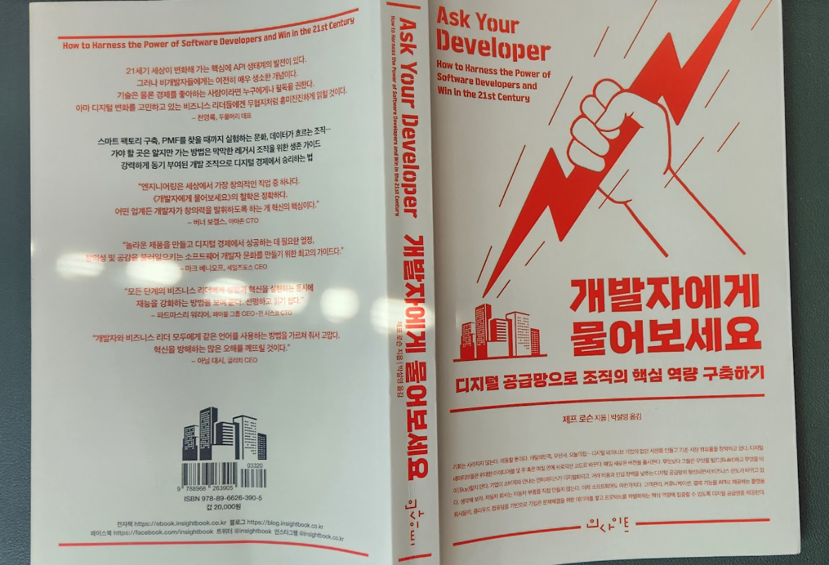 내가 이 책을 읽고 나서 든 생각은 한줄로 정리된다. 저자가 전달하고 싶은 메시지는 "개발자는 고객의 문제를 기술로 해결해서 비즈니스 가치를 더해주는 사람"이어야 한다는 것이다. 그렇기 때문에 고객을 중심에 놓고 커뮤니케이션을 할 수 있도록 조직을 구성하고, 그들이 하는 행동 하나하나가 고객의 느낌을 좋게 해주기 위한 실험이 될 때 더 큰 기업으로 성장할 수 있다. 원 제목은 "Ask your Developer"인데, 단순히 개발자에게 묻는 것이 아니라 개발자에게 요청하세요라는 의미로도 읽혀졌다.