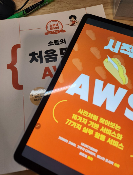 스터디를 시작할 때 즈음에 한빛미디어에서 AWS 입문서적이 두 권 출간되었습니다. '시작! AWS'를 주 교재로 삼고 '소플의 처음만난 AWS'를 보조 교재로 삼았습니다. 제 경우 첫번째 책은 전자책으로, 두번째 책은 종이책으로 마련했습니다.