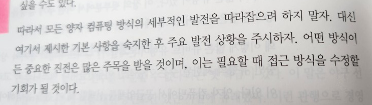4/ 책을 일독했지만, 여전히 몇개 단어가 눈에 조금 익혀졌을 뿐 여전히 양자 컴퓨팅을 제대로 이해하기 어렵다. (뭐 처음 책을 읽기 시작할 때도 제대로 이해할 것이라는 기대는 하지 않았다.) 누군가 나에게 그래서 책을 읽고 나니 양자 컴퓨터에 대해 어떻게 생각해 라고 질문한다면 미래를 바꿀지도 모르는 기반 기술인 것 같다 정도 외에는 딱히 할 말이 없다. 이 책은 양자 컴퓨터를 이해한다기 보다는 양자 컴퓨터에 관련된 이야기를 소개하는 입문서로 괜찮다 생각된다. 하지만 결코 쉽지 않은 책이고, 아마도 2독, 3독을 해야 할 것 같다.